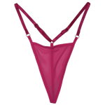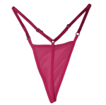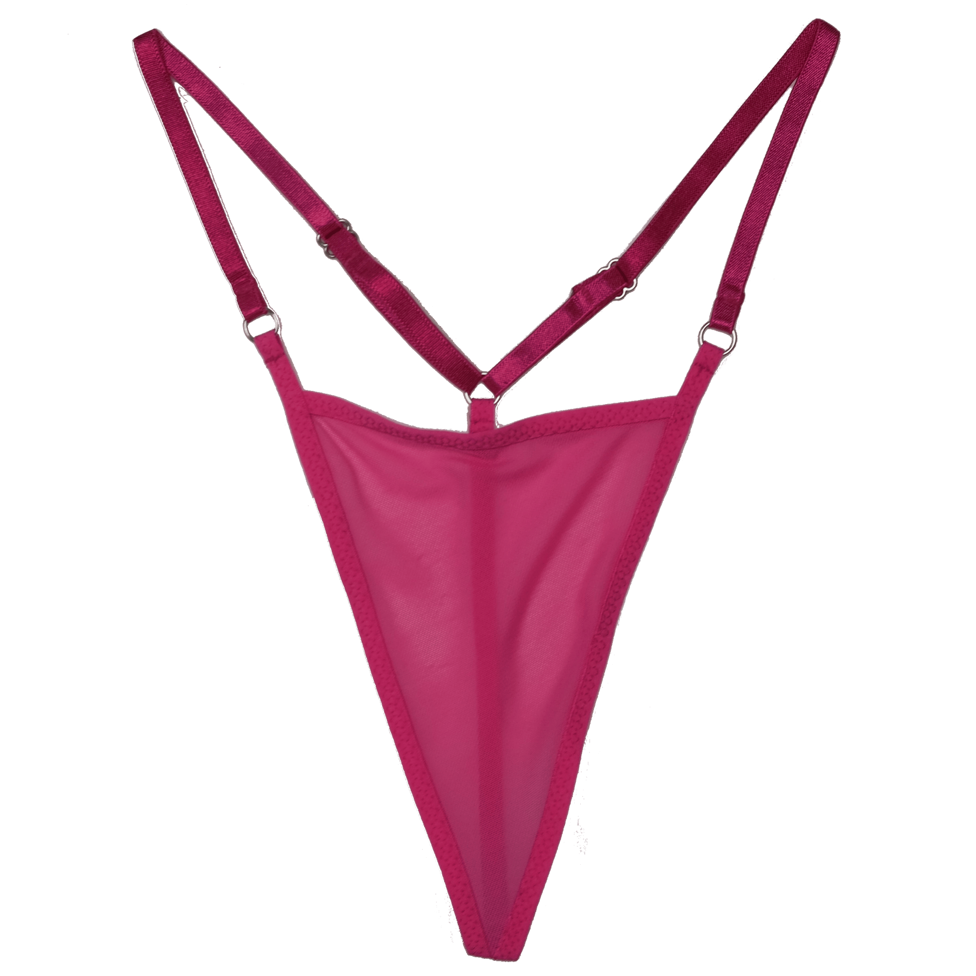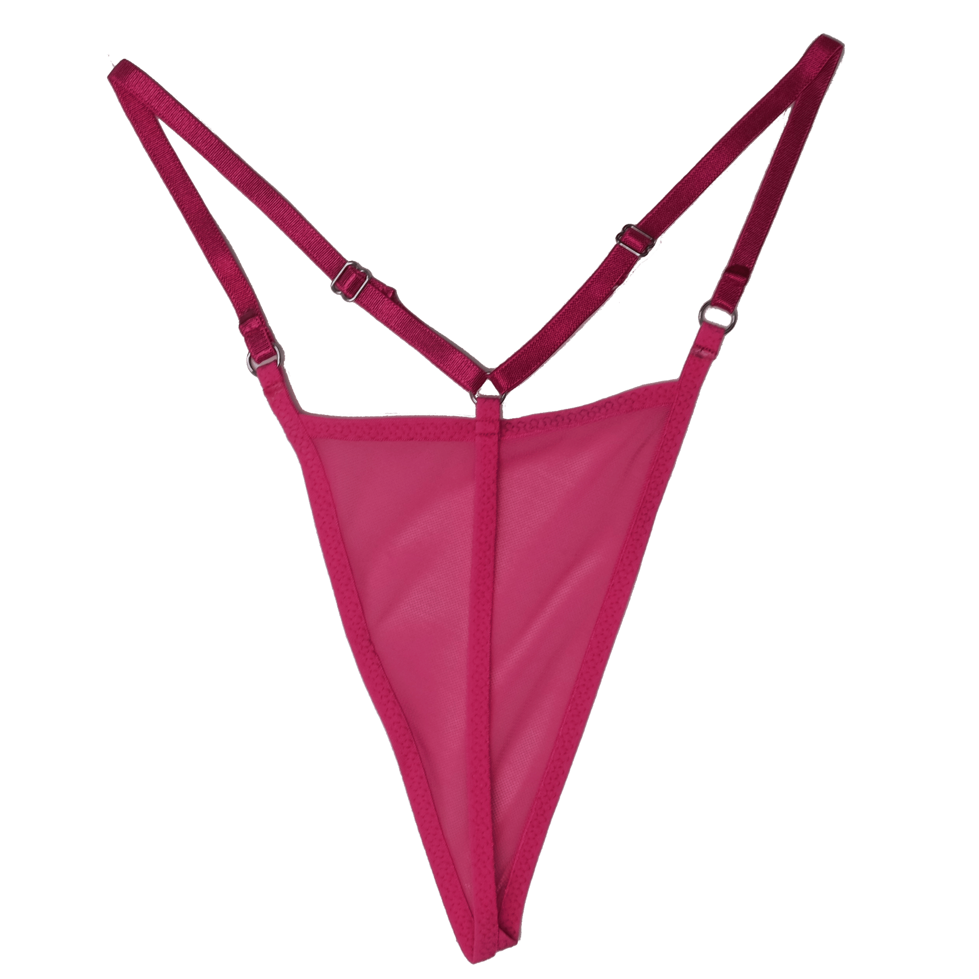 Barely there pink mesh perfect for under your favorite summer sundress! This pretty-in-pink g-string features silver colored hardware and hot pink satin elastic!